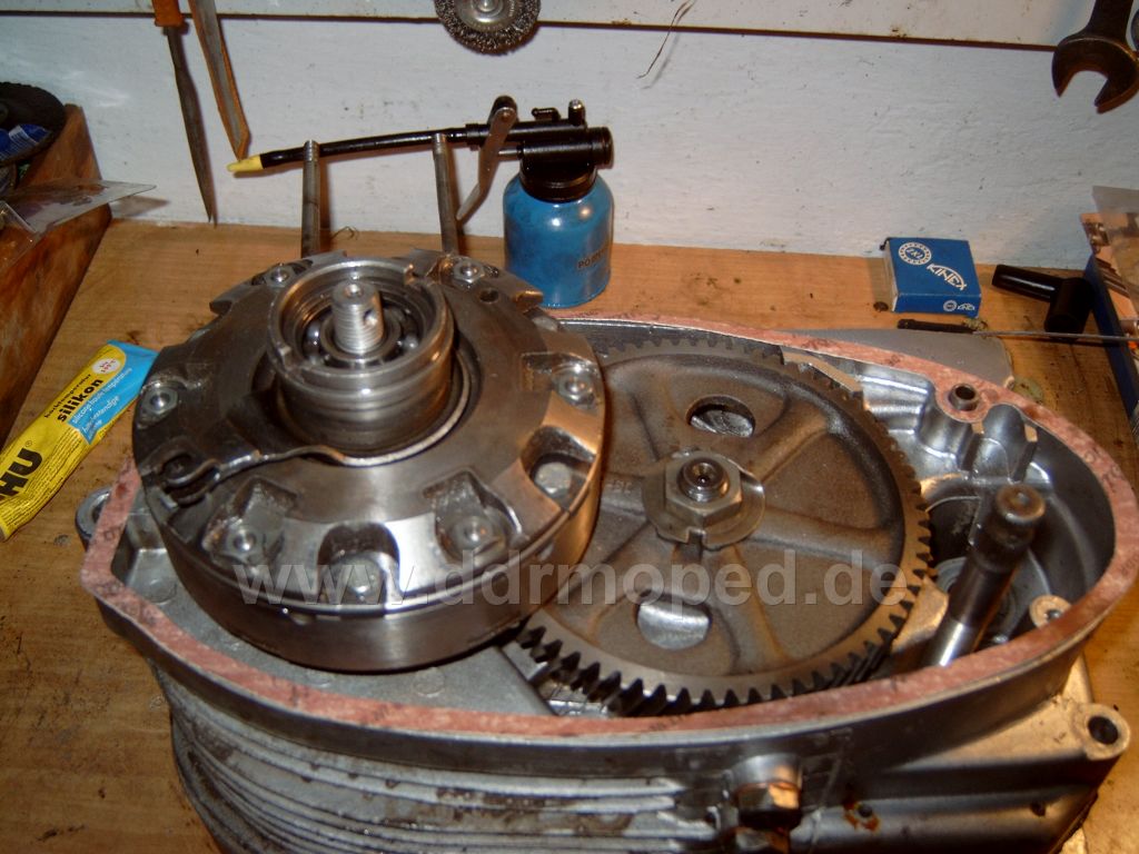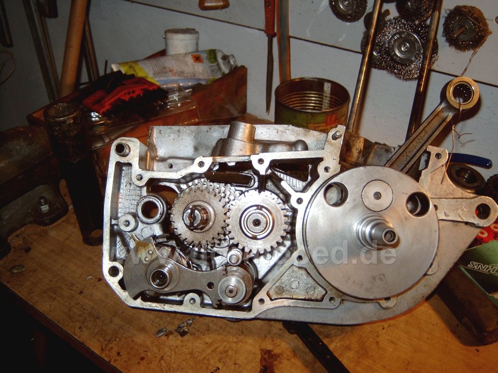 Der Schaltsatz und die Kurbel ist eingesetzt. Eigentlich kein Problem, wenn man die Reihenfolge der Einbauschritte beachtet und weiß, wie die Teile zusammen gehören. Leider ist meine Gehäusedichtmasse unbrauchbar geworden, insofern kann ich die Hälften heute nicht mehr zusammenfügen.