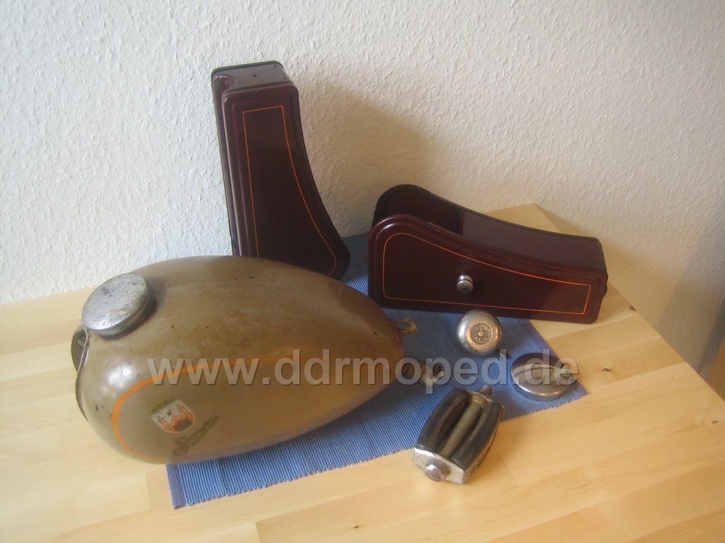 ...nunja, ich hatte das Glück nen neuen, maronen Werkzeugkasten mit Deckel fürn SR1 zu ergattern, dann noch nen beigen, hoffentlich halbwegs schnieken, völlig versifften Tank, nen extra Tankdeckel in Stahl verchromt, ne Einser-Pedale und ne Klingel. Bin zufrieden, was mich gestört hat waren die blöden Händlerstatments wie "...bei Ebay bekomm ich aber..." dies oder das dafür. Dann sollnse des Zeuchs da einstellen und nicht mit sich rumtragen.  Aber jeder will ja irgendwie leben... Fotos gibts später, muss jetzt erstmal des Zeuchs sichten und grob putzen... Grüsse, der Eike