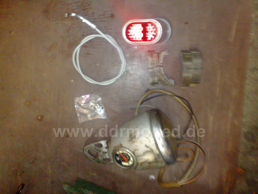 Hallo Leute, war ja heute auch in Langenwolmsdorf auf dem Teilemarkt . Hab auch was nettes gefunden wie ich finde. Mir fehlte noch die Beleuchtung, hab ich auch bekommen. Ich habe einen Scheinwerfer, ein Rücklicht, Gasbowdenzug, Nieten fürn Sitz und 2 paar Bremmsbacken bekommmen für.....egal.
