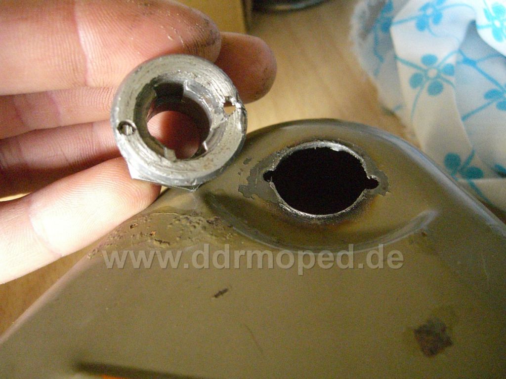 Hallo! Der Essi läuft seitdem ich die Konen vorne gegen originale getauscht habe wieder schön rund, aber als ich letztens mal ins Werkzeugkastenfach wollte, da gings nicht gleich auf, weil da so ein hässliches Nachbauschloss drin ist. Da ich noch ein originales zu liegen habe, wollte ich das heute mal gegen das Nachbaudingens tauschen. Dann musste ich aber mit Erschrecken feststellen, dass der Vorbesitzer da Scheiß gemacht hatte. Schauts euch selbst an, nu kann ich den Deckel wegschmeißen, man bin ich sauer