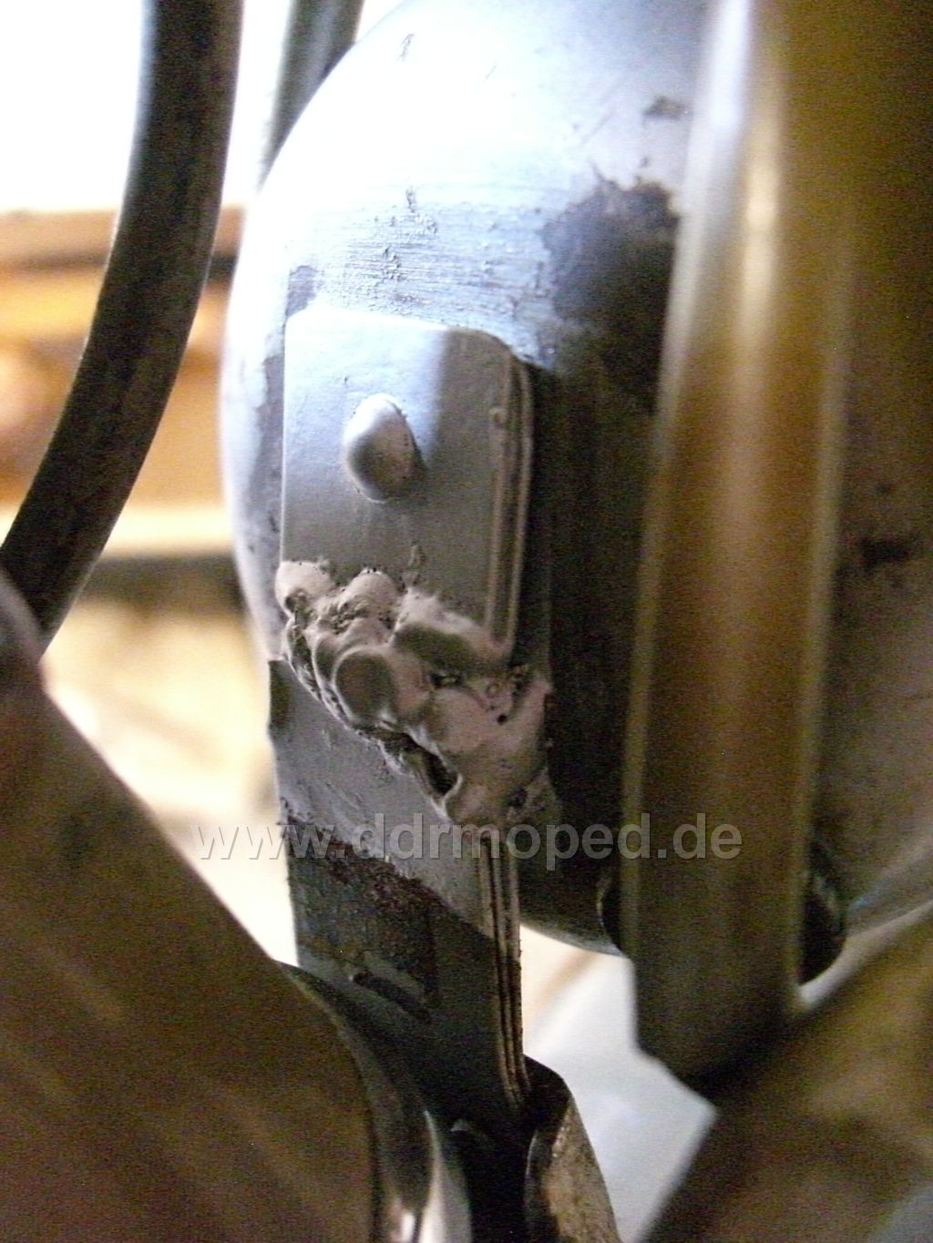 Das ist mir vor nicht allzu langer Zeit auch passiert. Ein Schlagloch und plötzlich klapperte was.Da hing sie nur noch am Kabel. Ich hab sie erstmal mit dem Rest Halteblech zwischen Halter und Gabel eingeklemmt, werde aber bei Gelegenheit mal ein Edelstahlblech neu annieten.Ursprünglich wars wohl eine Art Federstahl in mehreren Lagen.Das hat die S50/51 Hupe auch noch so.