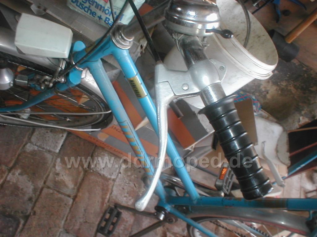 Hallo Jörg, Der Bremshebel ist vom DDR- Mifa oder Diamantfahrrad, Die zweiflüglichen Alumuttern sind meist für Sporträder von Mifa und Diamant benutzt worden. Der Bremszug weiter oben ist ebenfalls fürs Fahrad. Der Bowdenzug gehört da nicht dran, der ist von irgendein Mopet.