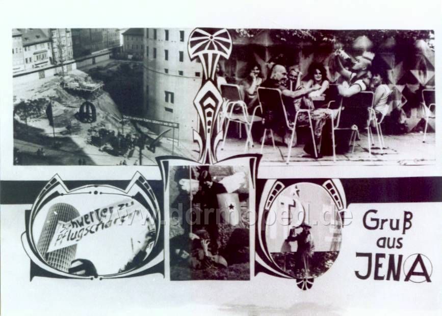 und hier unser, ach so gesittetes jena der 80ziger doch nicht etwa mit punks???? mit baustellenfoto für den penis-jenensis, für desser entstehen der rest der altstadt weichen musste, mit traditions-eichplatz !!!! schlimme zeiten die 70ziger mit dem rest ulbricht und beginnenden erich-wahn heute würde viel geld ausgegeben für den erhalt von etwas altstadt, die noch geblieben ist nach schlimmen bombennächten, wer fragt jedoch noch heute? heute wuseln wir um 2 cubikmeter stadtmauer im boden, decken sie mit glas und erleuchten sie in der nacht !!! hisi